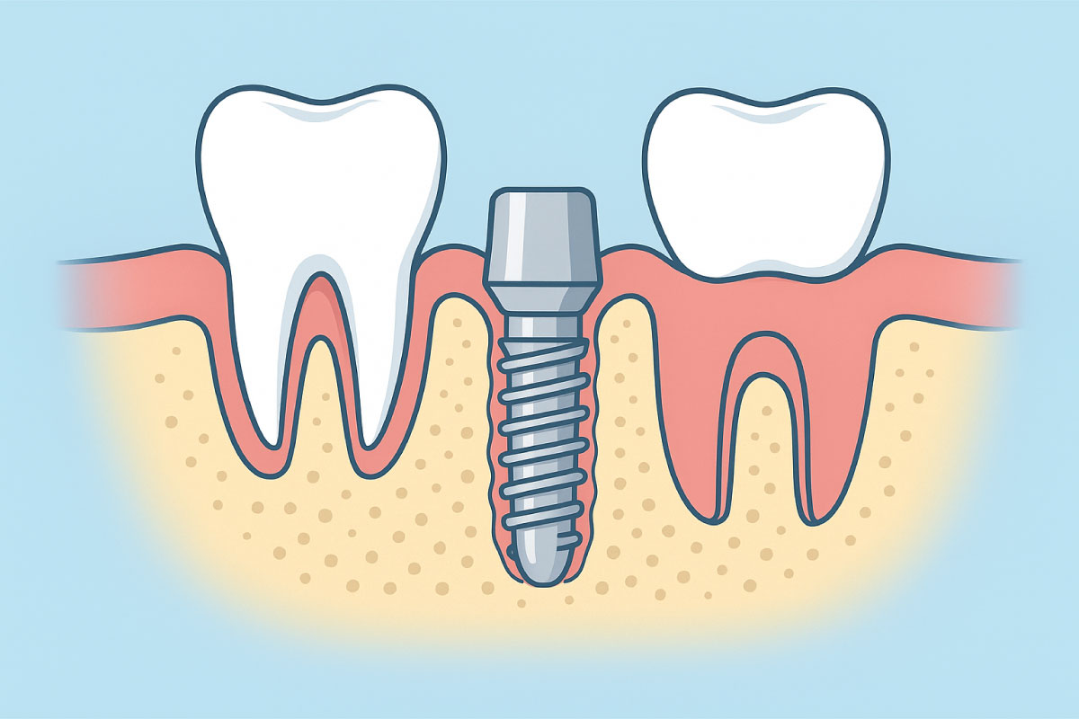 Los implantes dentales son aditamentos de titanio que sustituyen la raíz del diente perdido. Sobre ellos se coloca un pilar (muñón) y, finalmente, una corona con la forma y color del diente natural.