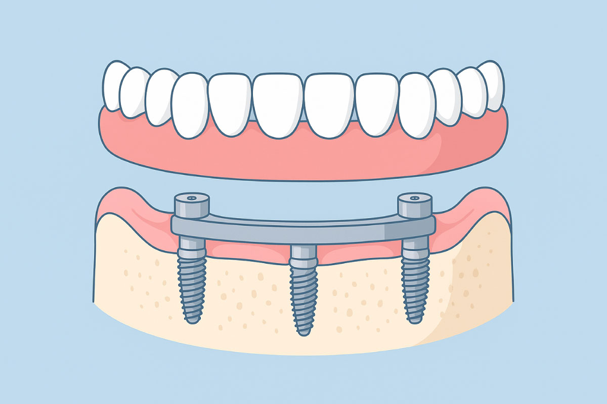 Prótesis fija para arcada completa: estructura (barra) metálica + dientes en resina/porcelana y resina rosa que simula encía. Se atornilla a 4–8 implantes y solo la retira el dentista.