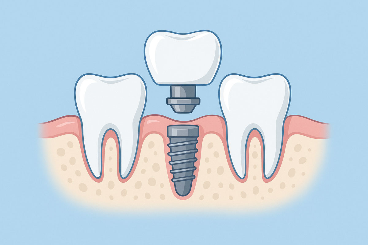 Los implantes dentales son aditamentos de titanio que sustituyen la raíz del diente perdido. Sobre ellos se coloca un pilar (muñón) y, finalmente, una corona con la forma y color del diente natural.